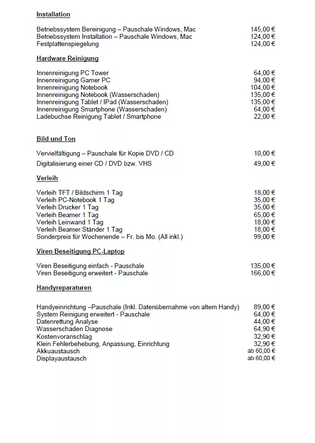 Alle Preise für unsere Dienstleistungen & Produkte